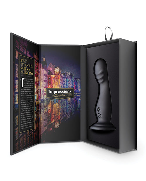 The Impressions Amsterdam is ready to deliver fun all year long! The sleek curves of Amsterdam match your anatomical pleasure points and the ribbed head provides additional, powerful sensations to your play. With powerful vibrations that cycle through 5 levels and 5 variations of pulsation and escalation using the Rumble Tech motor, Amsterdam is ready to take you on the ultimate adventure. The flared base makes it harness compatible and safe for anal play. The powerful suction cup allows you to play hands free; just stick it to any smooth, flat surface. Amsterdam has Magna Charge USB magnetic recharging to ensure it remains waterproof for the lifetime of the product and IPX7 waterproof for easy cleaning. Ultrasilk smooth and made with Puria Platinum-Cured Silicone, it's body-safe, and phthalate free. With Impressions, the possibilities are endless, so pack up and get ready to go to Amsterdam!
