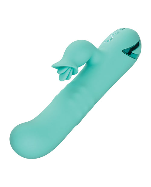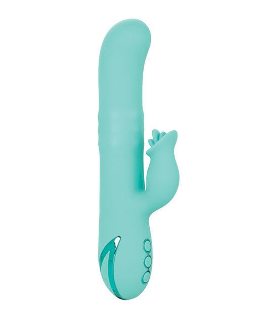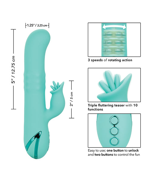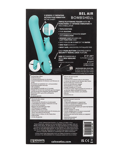 Dive deep into pools of pleasure and sun-kissed fantasies with the posh California Dreaming? Bel Air Bombshell. The luxurious massager has 10 intense vibration functions, 3 independent shaft rotation functions and a unique triple teaser for one-of-a-kind pleasure experience. The seamless silicone body and flickering teaser put out knee-shaking stimulation in and out of the water. Whether you?re looking to turn up the heat with a lover or just enjoy some sensual solo time, this ravishing rabbit is ready. While contoured bunny teaser flickers and moves with your body, the 3 speeds of rotating beads in the shaft deliver thrilling g-spot stimulation. Control and customize your pleasure play with the independently controlled shaft rotation functions and teaser vibration functions. The knee-shaking gyrations packed into this playful vibe aren't for the faint of heart! Triple power motors put out deep rumbling vibrations and powerful suction. Recharge the massager in 2.5 hours with the provided USB charging cable to enjoy 35 minutes of high-speed stimulation or 90 minutes of low speed vibrations. Enjoy frustration-free control with the easy-touch 3-button control pad and security lock feature for travel-ready teasing. The virtually seamless body and self-sealing charging port allow you to get this versatile waterproof vibe for a dip. The hypoallergenic premium silicone is body safe, unscented and phthalate free to keep you most sensitive spots, happy and healthy.