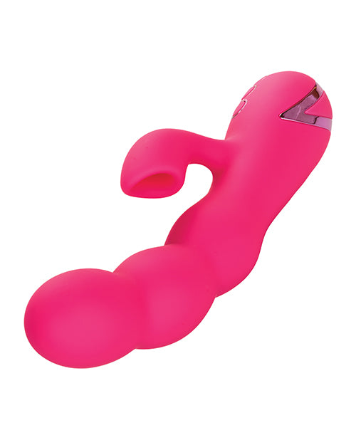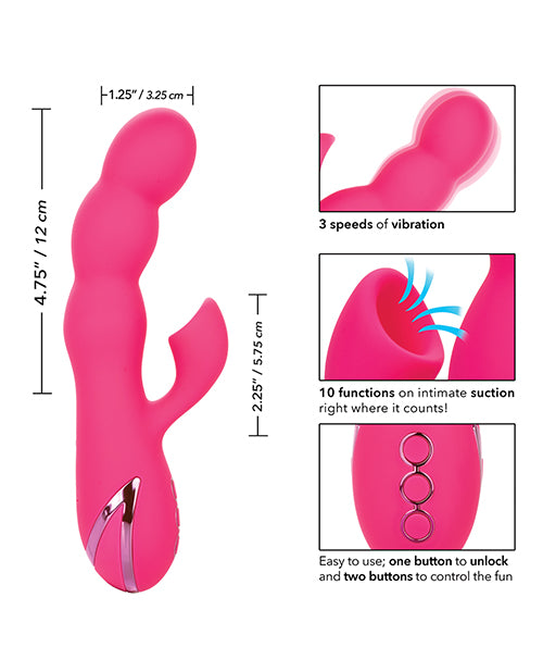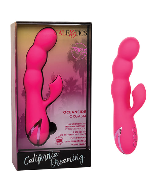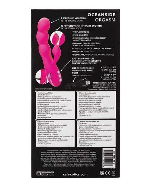 The playful California Dreaming® Collection brings sunkissed fantasies to life with the marvelous Oceanside Orgasm. The uniquely designed massager is ready to ready to relive your favorite summer fling fantasies with 10 powerful functions of clitoral suction and 3 knee-shaking vibration speeds. While the flickering vibrations work their magic, the full-coverage suction tip gives you knee-shaking suction stimulation. The stimulating encaser has 10 functions of suction for wave after wave of orgasmic external stimulation. The shivering shaft of this ravishing rabbit uses an intense vibration motor for deeply satisfying internal stimulation. The flexible tickler vibrations can be used independently from the suction functions for truly customizable pleasure. The knee-shaking gyrations packed into this playful vibe aren't for the faint of heart! Triple power motors put out deep rumbling vibrations and powerful suction. Plug the provided USB cable into the self-healing charging port to recharge your passion in 2.5 hours. Thrill with up to 90 minutes of vibrating pleasure. To effortlessly control stimulation, the sleek 3-button control pad lets you independently operate the vibration and thumping options. The high-tech memory chip remembers just how you like it resumes play on the last function used.