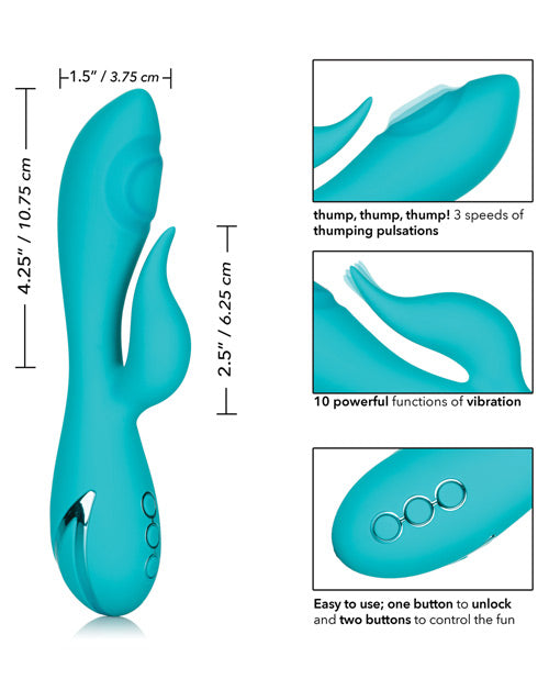 The playful California Dreaming Collection brings star-studded fantasies to life with the passionate Santa Monica Starlet. The ergonomically designed massager is ready to ready for those A-List fantasies with 10 poweful functions of vibration and 3 knee-shaking thumping pulation speeds.