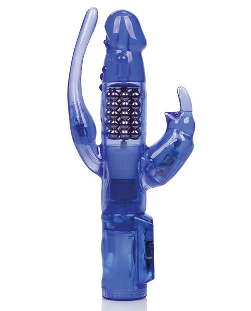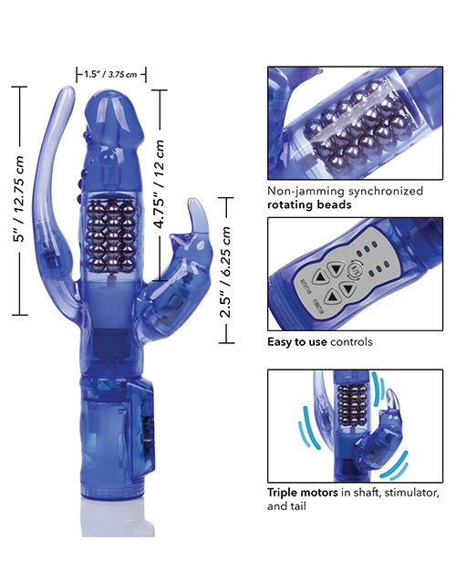 Three knee-shaking vibration motors deliver thrilling vibrations throughout the flutter rabbit ears, tickling tail and rotating shaft. The pliable, jelly-like tickler and tail shaped anal probe can be used independently from the shaft rotation functions. Five rows of non-jamming beads deliver deep rumbling stimulation and thrill internal sweet spots to send you spiraling towards orgasmic ecstasy. Use the easy-touch control pad to independently control the plethora of pleasure options.