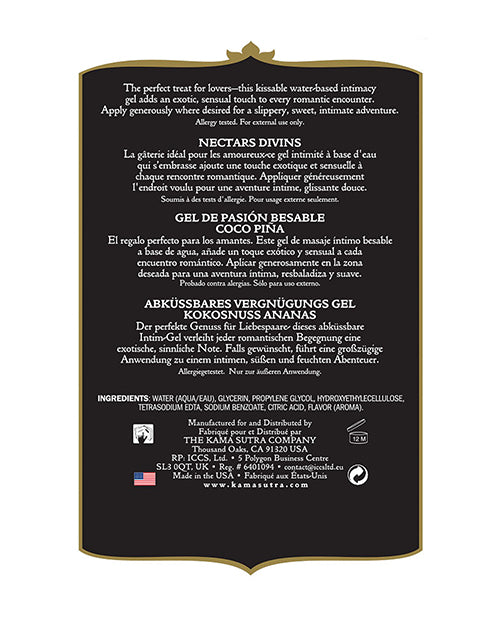 Kama Sutra's Divine Nectars is a water-based, flavored body glide. Use it anywhere on the body. Adds the perfect amount of slip and glide to any intimate activity with a splash of juicy, kissable flavor! Drizzle all over the body...anywhere you want to kiss or be kissed. Rub it, kiss it, lick it.... The possibilities are endless. Coconut Pineapple - Sweet, creamy coconut with a splash of juicy pineapple nectar.
