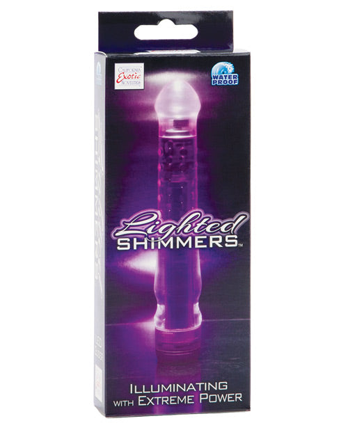 From Cal Exotics comes the Lighted Shimmers LED Glider. The Lighted Shimmers set the mood...turn off the lights, turn on the vibrations, and enjoy the light show! It's illuminating with extreme multi-speed power! Elegant, smooth and sleek high speed vibrator lights up with a brilliant LED. The uniquely contoured design allows for optimum stimulation. Requires 2 AA batteries.