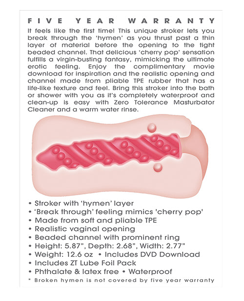 Like a virgin stroker with "hymen" layer. 'Break through' feeling mimics 'cherry pop'. Realistic vaginal opening and beaded channel with prominent ring. Includes: DVD download and ZT lube foil pack. Latex free. Waterproof. Material:TPE Height: 5.87 inches, Depth: 2.68 inches , Width: 2.77 inches Five Year Warranty.