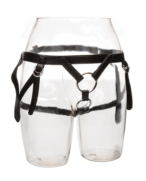 Surrender yourself to your most erotic fantasies and dive deep into carnal pleasure whenever you slip into this fashion-forward harness. The dual rings can be removed and used with a single ring instead (not included). The fully adjustable waist fits up to a 64” Waist (162.5 cm) and the interchangeable O-ring accommodates most probes and strap-on dildos with a diameter of 1.75” (4.5 cm).