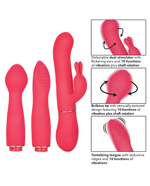 Deliver knee-shaking stimulation with the Teaser's 10 functions of vibration. Thrilling even the naughtiest with the G Bunny's dual motors and 10 functions of synchronized vibrations and shaft rotations. Whisk yourself away to a wonderland of passion while the Charmer delivers 10 functions of synchronized vibrations and shaft rotations.