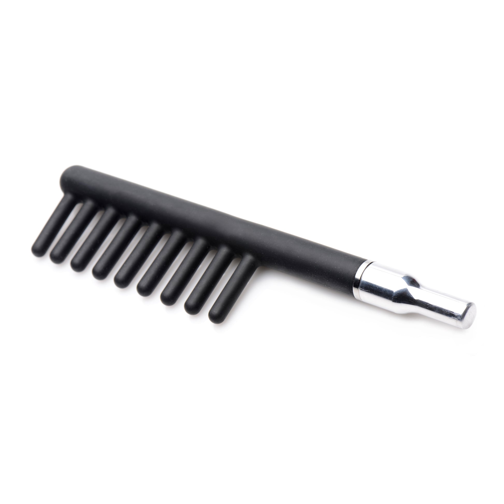 Sizzle the senses with electrosex! This Violet Wand set provides unique and intense sensations with silicone attachments that will not shatter like delicate glass. The mushroom-shaped accessory is ideal for sending pinpoint zaps of electricity into your slave or subs supple flesh. The comb features 9 teeth to transmit the current along a long strip of skin. Finally, the flogger will send a shock into them with every sensual stroke or swinging slap! The actual wand allows you to play with a wide range of power, from tingles to jolts. It features a silicone handle that enables a sturdy grip and a long cord that allows you to move freely around your playspace. Compatible with most violet wand attachments.