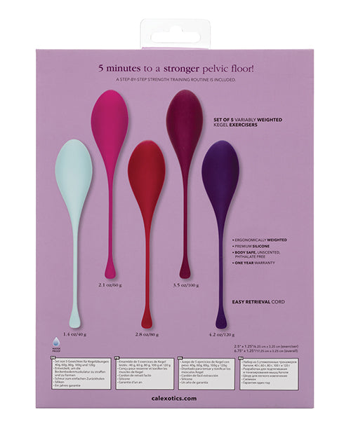 Tighten and tone pelvic floor muscles in only 5 minutes a day with the CalExotics Kegel Training 5-Piece Set. Give your pelvic floor muscles the training they have been craving with 5 gradually weighted exercisers to gently increase exercise intensity and sexual pleasure. The 5-piece set includes a 40 g, 60 g, 80 g, 100, and 120 g and a full workout routine. While the dual weights work to increase sexual arousal, they?re designed to gently tone and strengthen pelvic muscles. By working those key love muscles, you reduced the risk of pelvic floor disorders or incontinence, while increasing erotic pleasure. An extended retrieval cord makes removal quick, easy, and gentle. The kegel weights are made from a hygienically superior silicone. This body safe material is unscented and phthalate free to keep your most sensitive spots happy and healthy.