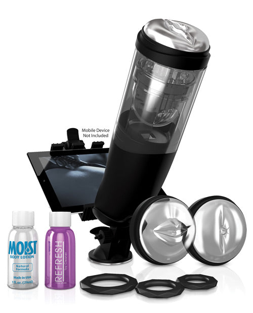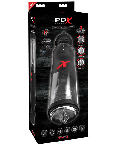 The Deluxe Mega-Bator is the only hands-free masturbator in the world that does all of the work for you, so you can experience the ultimate hands-free pleasure experience! The innovative Deluxe Mega-Bator combines hands-free rotation and thrusting that can be enjoyed in 10 unique patterns for completely customizable masturbation sessions.Enjoy the best of both worlds! Intense rotation combined with powerful piston-action thrusting - the innovative hands-free Deluxe Mega-Bator spins and thrusts you to explosive pleasure! With 3 interchangeable pleasure toppers you can enjoy a snug pussy, tight ass or supple lips depending on your mood. Slide through the realistic pleasure topper to enjoy a stimulating textured sleeve lined with rows of tiny ribs that tease your shaft with every thrust. The powerful motor ensures strong, steady rotation, piston-action thrusting, and exclusive sleeve suspension system will completely satisfy your entire penis, giving you the best stroker session you've ever had! Care Instructions: The PDX Elite Deluxe Mega-Bator toppers and sleeve are removable for easy cleaning. Simply unscrew the topper to switch or remove. Unclip the clear ring at the top of the sleeve case to remove the sleeve. The clear ring holds the sleeve in place for usage. The Deluxe Mega-Bator includes a travel cap for storage. Clean up is a snap after the fun with Refresh Toy Cleaner and warm water. If desired, use a water-based lotion like Moist with this product. Operating Instructions: Before You Begin - The Deluxe Mega-Bator is shipped with a plastic insert separating the magnets. The pleasure topper and sleeve must be removed in order to remove the plastic insert so the Deluxe Mega-Bator is ready to be used. Power On - Press the center button on the One-Touch Control Pad to turn your Deluxe Mega-Bator on. Start - Press the right arrow to start rotation and thrusting. Continue to press the right arrow to cycle through 10 pulsation patterns. Press the left arrow to return to the previous pattern. Intensity - Use the "+/-" keys to increase or decrease speed through 5 levels of intensity. LED Lights On - LED Lights are activated automatically when the Deluxe Mega-Bator is turned on. LED Lights Off - Press the center button to turn your Deluxe Mega-Bator off.