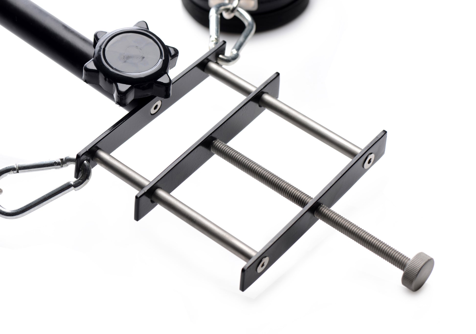 Keep those sneaky hands where you can see them! This bondage set includes a collar, cuffs, and a penis vice - all connected by a strong steel rod! Tighten the luxurious leather cuffs and collar around your playthings wrists and throat, then unscrew the lugnuts on the rod to fasten it to the collar. Attach the bottom bar, connected to the penis vice, and tighten the wheel to secure at the perfect height to clamp your slaves junk. Feed their cock and balls between the two plates and turn the thumbscrew to bring them closer and closer together until your pathetic partner is desperately trapped. Secure their wrists with the carabiner and have fun watching them try to defend themselves against your pinches, prods, and flogs, tugging on their package with every movement!