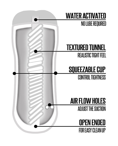 No Lube required - water activated shower stroker. Squeezable masturbation cup. Use Stroker alone or in cup. Feels so real tight tunnel. Dual air holes adjust suction. Extra long hang cord for shower. Easy clean open ended sleeve. Body safe and phthalate free.