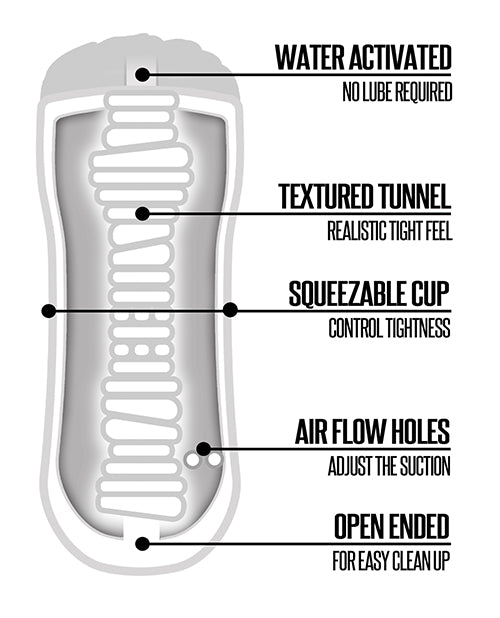 No Lube required - water activated shower stroker. Squeezable masturbation cup. Use Stroker alone or in cup. Feels so real tight tunnel. Dual air holes adjust suction. Extra long hang cord for shower. Easy clean open ended sleeve. Body safe and phthalate free.
