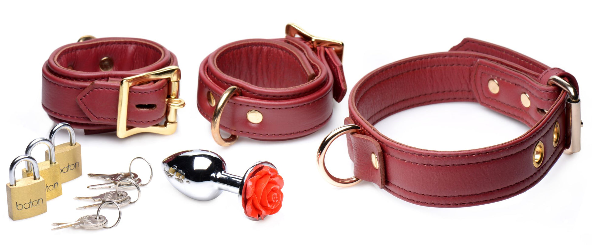 A sophisticated set of luxury leather restraints in beautiful burgundy are included to further captivate your submissive. The collar and cuffs are durable and secure, featuring a locking buckle that allows you to keep your precious plaything under lock and key. D-rings allow you to attach a connector chain, rope, or a variety of devious accessories. The jewel butt plug allows you to keep her ass stuffed whenever you desire, and gives you a sparkly surprise when she bends over.