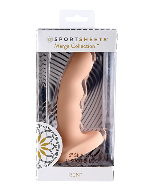 The Ren 6-inch, solid silicone dildo from the Sportsheets® Merge Collection® is the creation of pleasure and versatility combined. With its flared base, Ren can be used with O Ring and underwear style harnesses and used externally or internally for partner and solo play. The ample curvature, nonrealistic pleasure-bump shaft and tapered tip encourages G spot and P Spot stimulation, and the soft silicone creates an ultra-smooth sensation making it feel like a dream. Merge with pleasure.