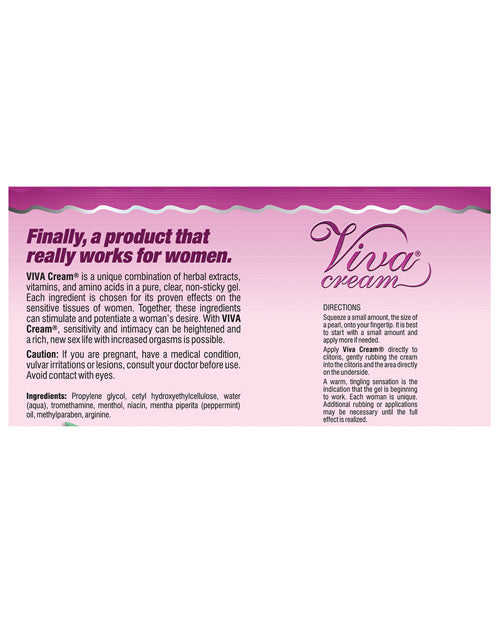 Viva Cream® Whether 18 or 80, women are seeking ways to enrich their life and bring more passion and intimacy into their relationships. Studies show up to 50% of women will experience a sexual dysfunction in their life and that the majority of women do not achieve orgasm from intercourse alone. If orgasm is achieved, it is most often due to clitoral stimulation. Now, with Viva Cream®, sensitivity and intimacy may be heightened and a new rich orgasmic sexlife is possible. Viva Cream® is a unique combination of herbal extracts, vitamins, and amino acids in a clear, non-sticky gel. Each ingredient has been chosen for its proven effects on the sensitive tissues of women. Using Viva Cream® may stimulate and potentiate a woman's desire, aiding in intensifying arousal. Viva Cream® is made for the demands of every woman who wants more.
