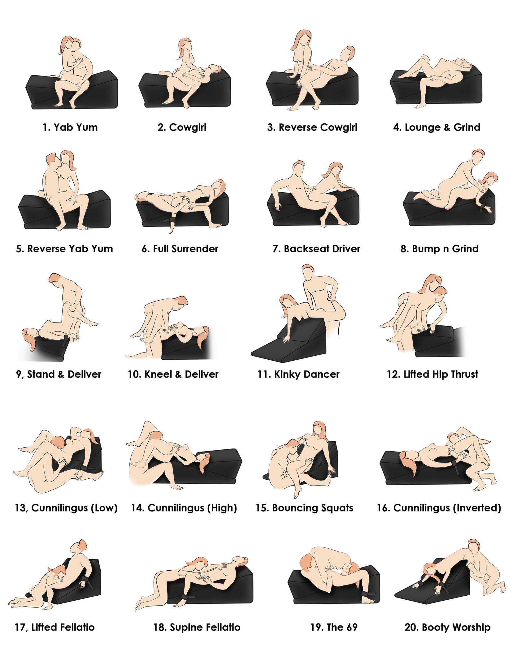 This bondage pillow set includes 2 wrist cuffs, 2 ankle cuffs, 4 connectors with D-rings and 2 restraint connectors. There are also built-in clips for restraints or other accessories. Attach your lover's wrists and ankles to the pillow wedge. As they lay down or lean on the wedge, their own body weight becomes the anchor that keeps them bound. Lift up their hips for easy access to their G-spot or P-spot, turn them over and play with them in Doggy position, or support your own knees as you kneel on it with them! The velvety feel of the soft outer cover adds sensuality to your kinky session. The wedges are also lightweight so you can easily travel with them for overnight stays and parties!