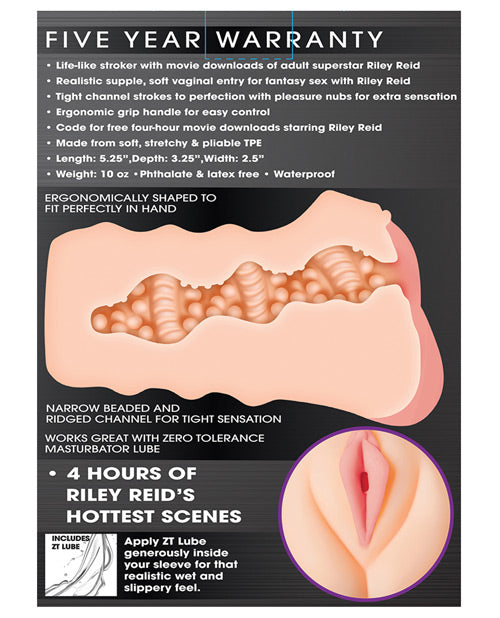 Vagina Stroker Riley Reid from Zero Tolerance Toys. Life like stroker with movie downloads of adult superstar Riley Reid. Realistic supple, soft vaginal entry for fantasy sex with Riley. Tight channel strokes to perfection with pleasure nubs for extra sensation. Ergonomic grip handle for easy control. Code for free four hour movie downloads starring Riley Reid. Made from soft, stretchy and pliable Thermoplastic Elastomers TPE. Length 5.25 inches, depth 3.25 inches, width 2.5 inches. Weight 10 ounces. Made using body safe phthalate free and latex free materials. 5 year warranty.