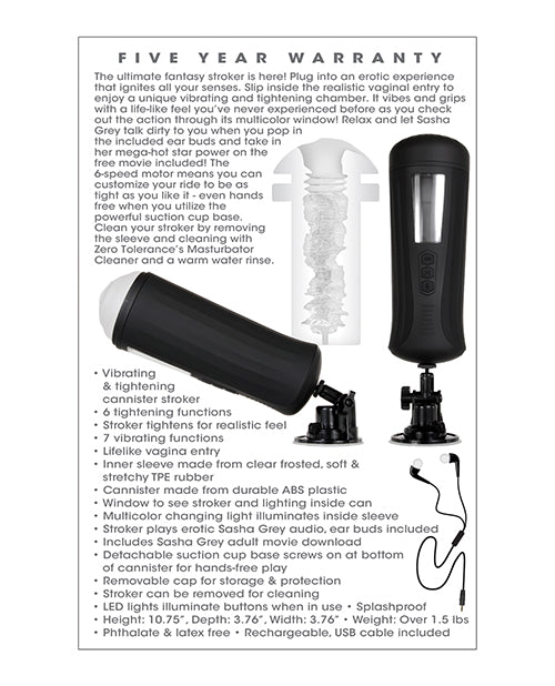 The ultimate fantasy stroker is here! Plug into an erotic experience that ignites all your senses. Slip inside the realistic vaginal entry to enjoy a unique vibrating and tightening chamber. It vibes and grips with a life-like feel you ve never experienced before as you check out the action through its multicolor window! Relax and let Sasha Grey talk dirty to you when you pop in the included ear buds and take in her mega-hot star power on the free movie included! The 6-speed motor means you can customize your ride to be as tight as you like it - even hands free when you utilize the powerful suction cup base. Clean your stroker by removing the sleeve and cleaning with ZT s Masturbator Cleaner and a warm water rinse.